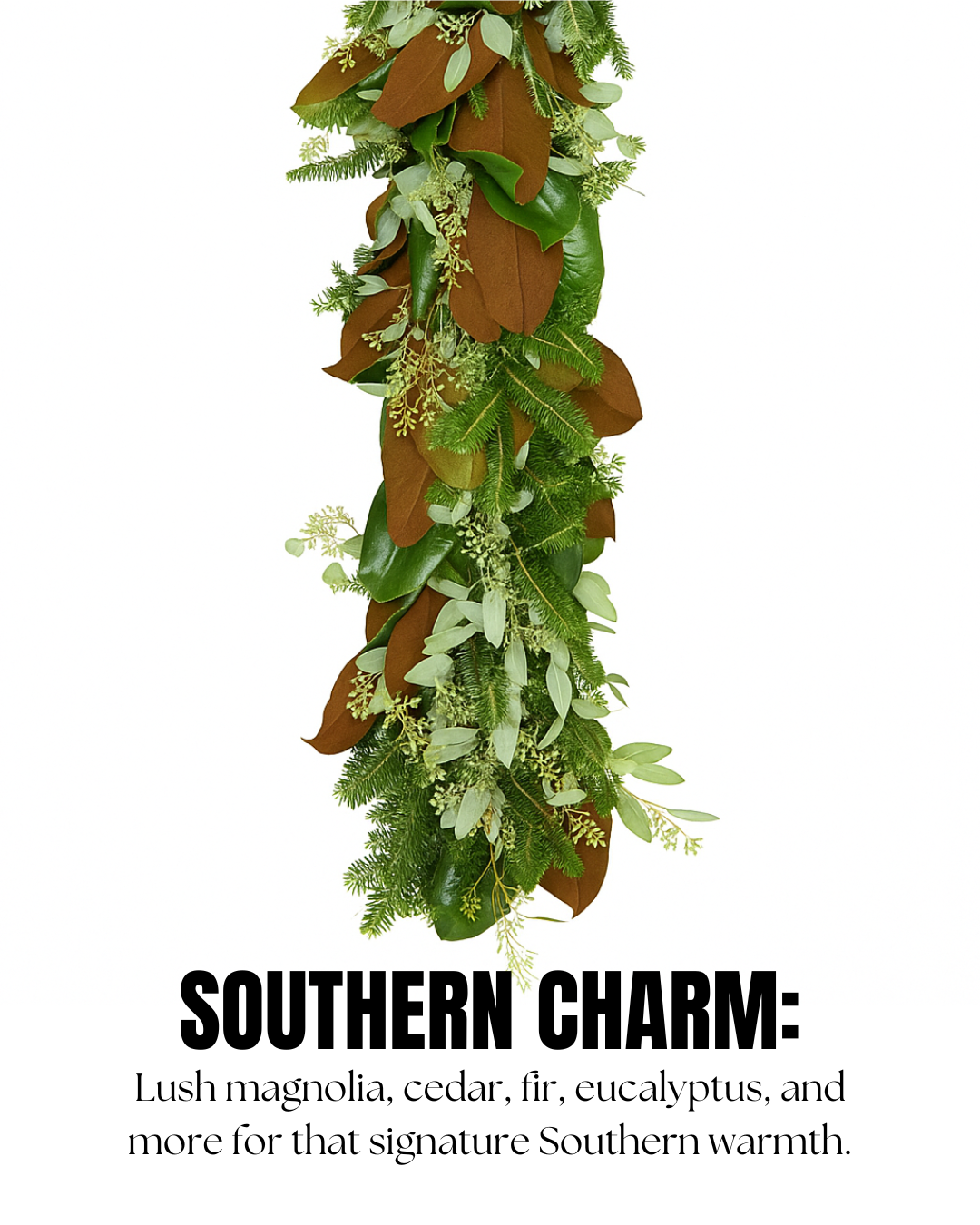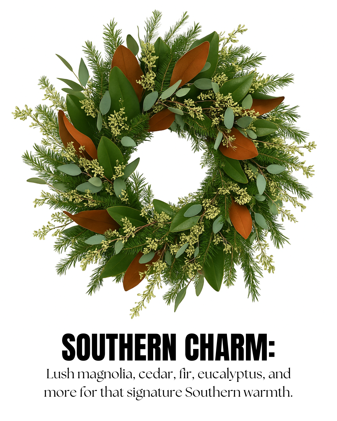 - Southern Charm Upgrade ($225): A stunning combination of cedar, Douglas fir, eucalyptus, magnolia, smilax, and graceful greenery that captures the heart of a Southern holiday. Beautiful magnolia leaves and fragrant eucalyptus meet the deep greens of winter for a look that feels abundant, warm, and full of welcoming charm.